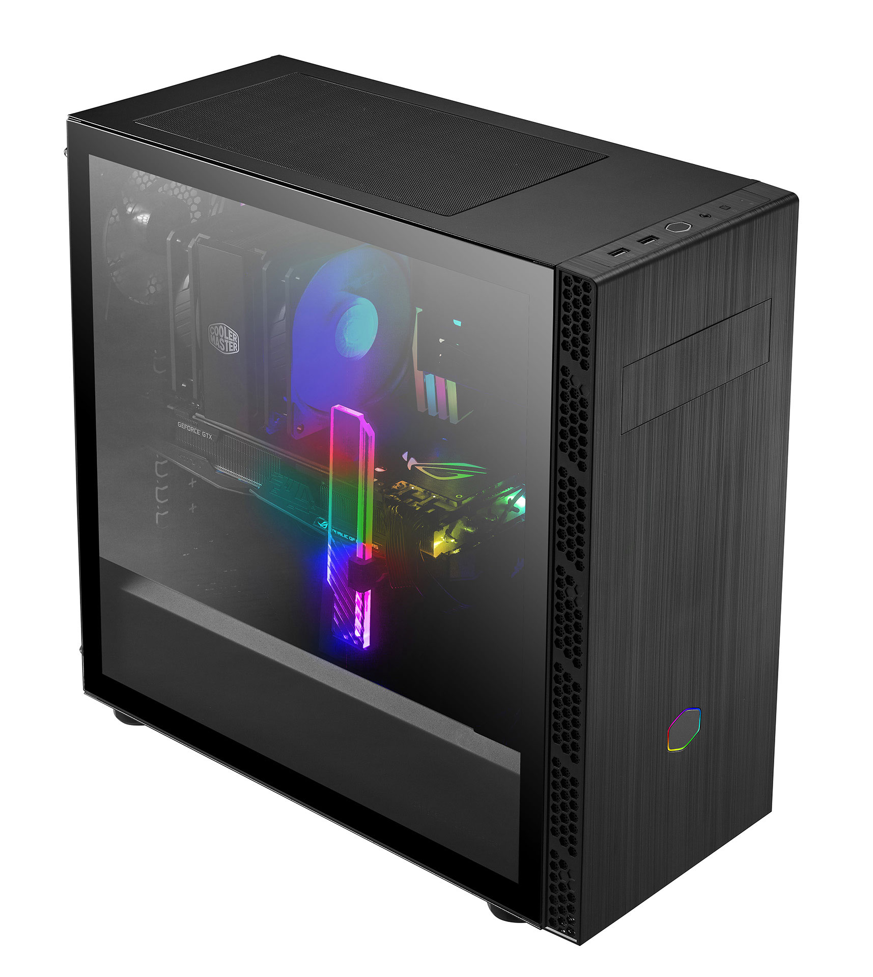 Přesným opakem extravagantního modelu je MB600L V2 zakládající si na střídmé eleganci. Temný odstín a kartáčovaná úprava povrchu předního panelu, který narušuje jen decentní šestiúhelníkové logo Cooler Master, předurčuje skříň do moderních pracovních prostor. Pokud je za předním panelem instalován RGB či ARGB ventilátor prosvítá logem jeho podsvícení.